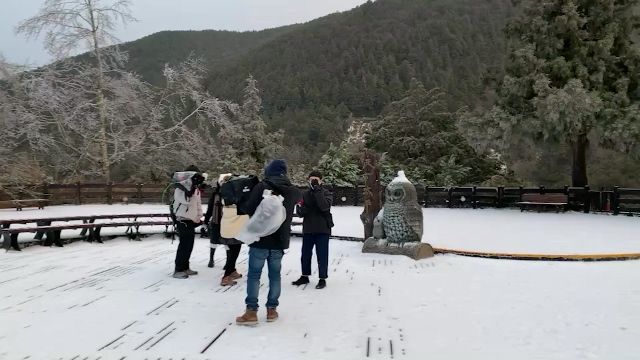 下雪了!寒流來襲,太平山國家森林遊樂區在23日一早,溫度-3°C「雪片紛飛」,雪白夢幻美景令遊客驚喜。目前,因下雪,通往太平山道路,車輛需有裝雪鏈才可以上山。
