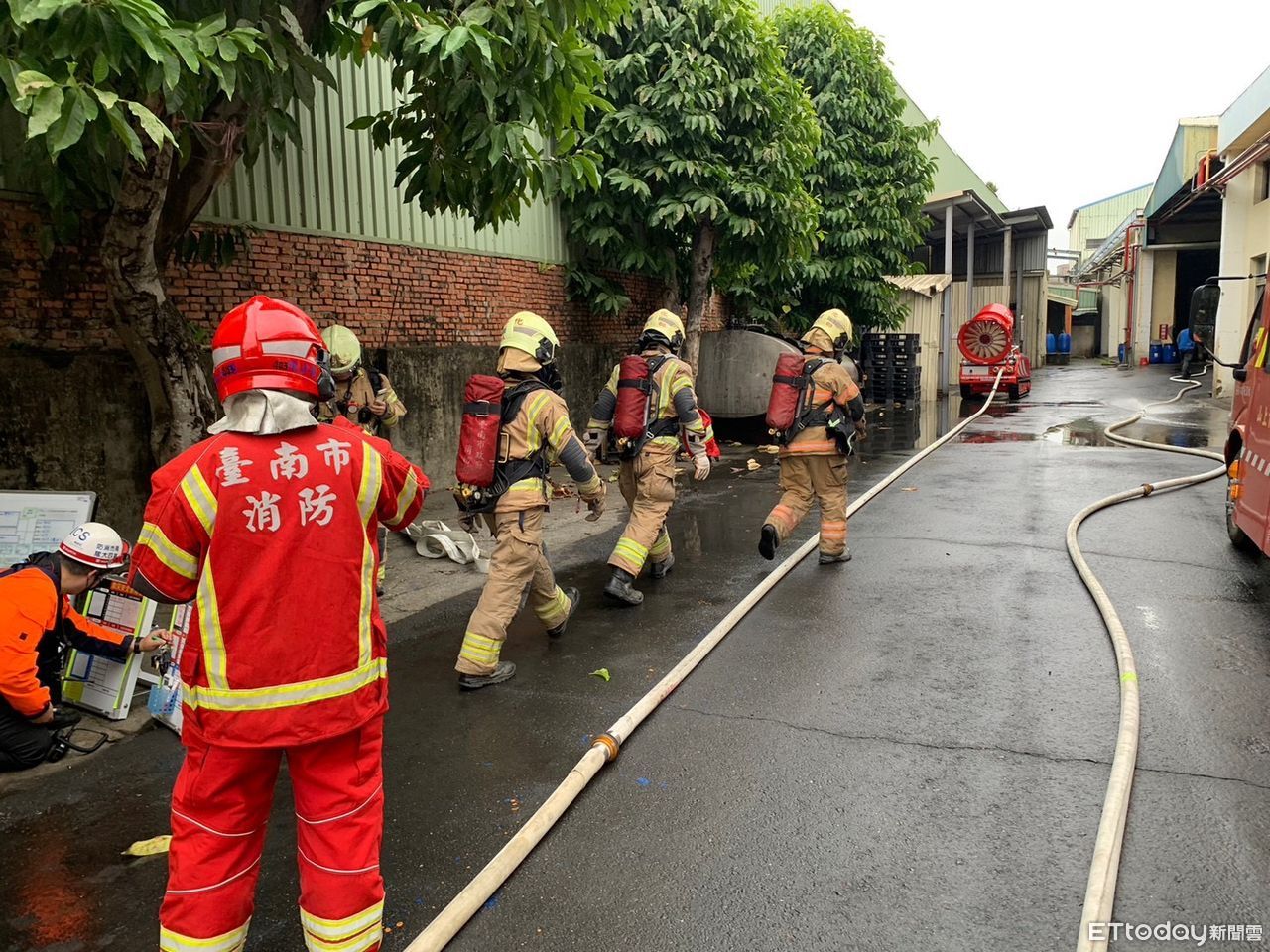 ▲台南市消防局第四大隊在山上區晉盟實業公司,辦理火災搶救演練,提升場所應變及消防人員救災安全。(圖/記者林東良翻攝,下同)