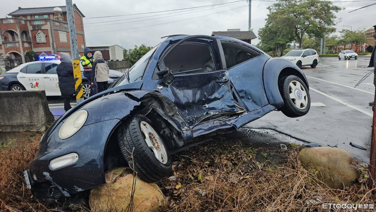 竹南警分局新港派出所今天上午8點接獲報案,後龍鎮高鐵六路旁,發生自小客車碰撞事故,員警獲報到場發現兩輛自小客車卡在路旁動彈不得,其中一部深藍色自小客車衝到路邊駁坎,左側車門凹陷,駕駛從右側車門脫困,身體多處擦挫傷,由救護車送醫。