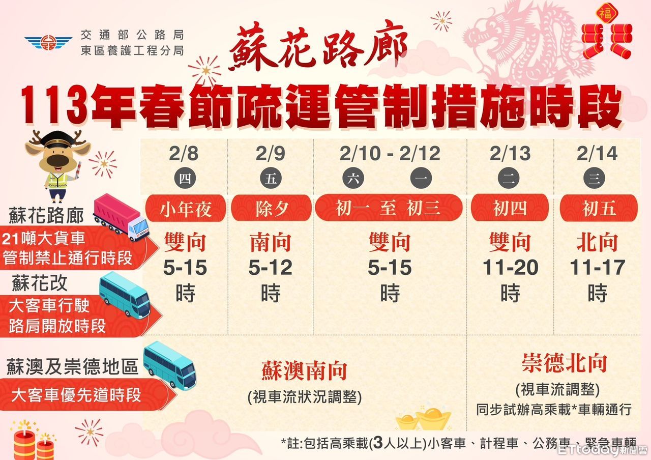 另因應連假蘇花路廊湧入之大量車潮,公路局東區養護工程分局將藉由時段性車種管制,以紓解尖峰時段之車流,113年春節連續假期台9線及台9丁線蘇花路廊(蘇澳至崇德)路段,開放大客車行駛蘇花改路肩(緊急空間)及禁止21公噸以上大貨車通行時段如下: