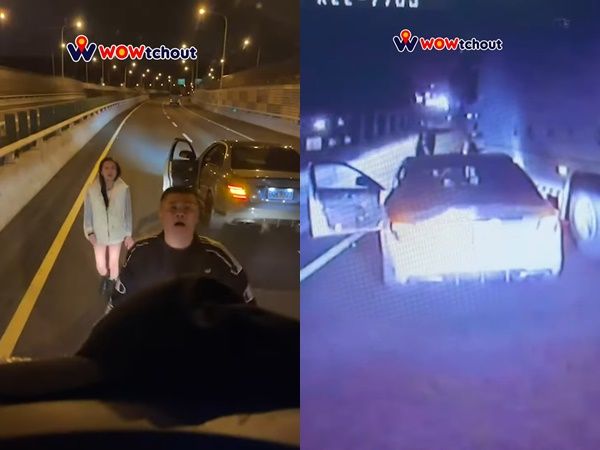 期間,賓士男卡在內線道,不斷逼近一輛大車,沒想到跟對方切到外側車道後,瞬間前方、左側、後方被3輛大車包圍,氣得他衝向路肩超車,在大車前急煞,讓另輛聯結車直接協插賓士前方。此時,賓士男也下車拉開聯結車的車門嗆聲。