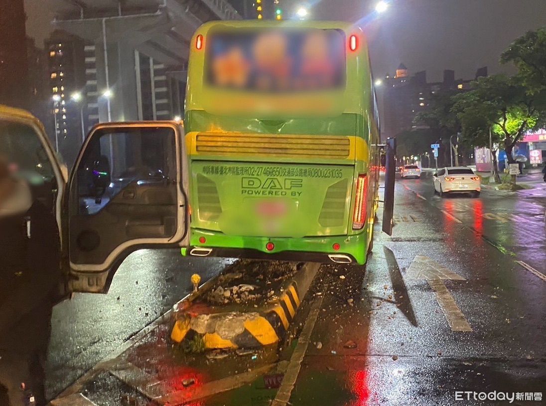 ▲▼新莊遊覽車自撞卡分隔島,造成思源路大塞車 。(圖/記者戴上容攝)