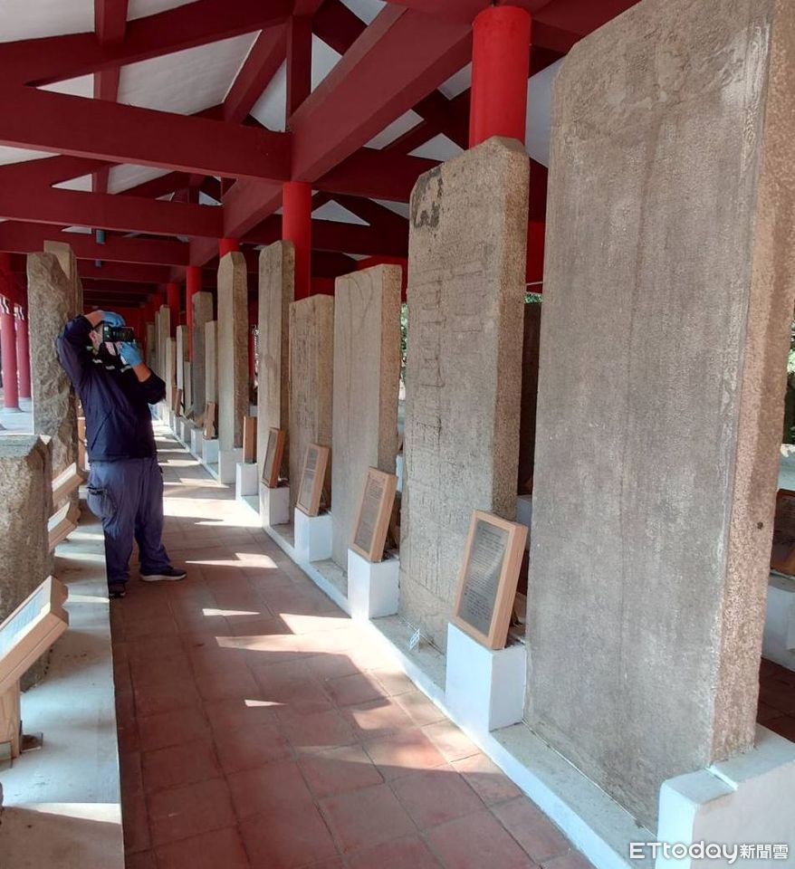 ▲台南市南門碑林石碑遭潑灑不明溶液,文化局發現溶液附著於許多石碑表層,致生色差並有結晶現象,文化局報警查處偵辦。(圖/記者林東良翻攝,下同)