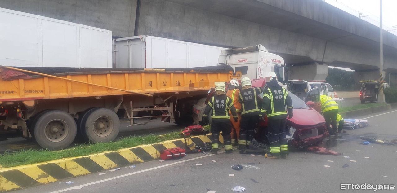 桃園市中壢區今(27日)下午發生一起嚴重車禍!一輛砂石車攔腰猛撞橫向穿越馬路的一輛轎車,車上4名男子,其中1人當場被甩飛車外,其餘3人則卡在變形的轎車中。警消獲報到場,立即出動破壞機具協助受困傷者脫困,但除了駕駛之外,其餘3人均已無生命跡象,緊急送醫搶救中。