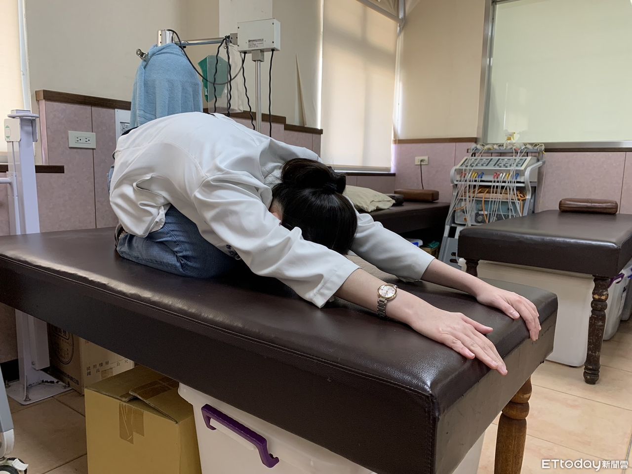 ▲物理治療師示範三式伸展及訓練運動,舒緩大掃除引起的肩頸痠痛。(圖/記者吳世龍翻攝)