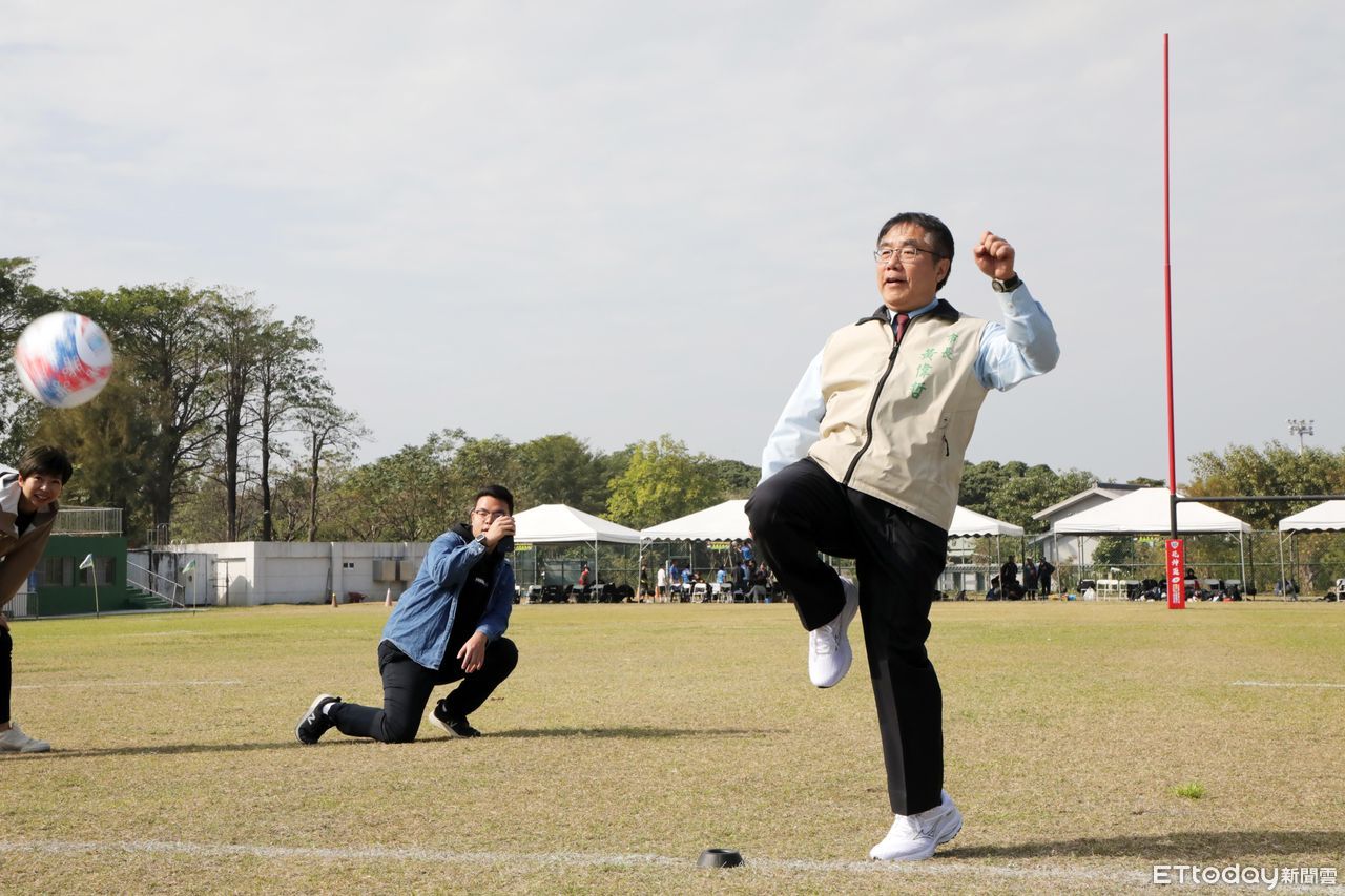 ▲2024年台南市第一屆元坤盃國際青年7人制橄欖球邀請賽,27日下午於台南市立橄欖球場盛大揭幕,市長黃偉哲與理事長杜元坤共同開球,宣告比賽開始。(圖/記者林東良翻攝,下同)