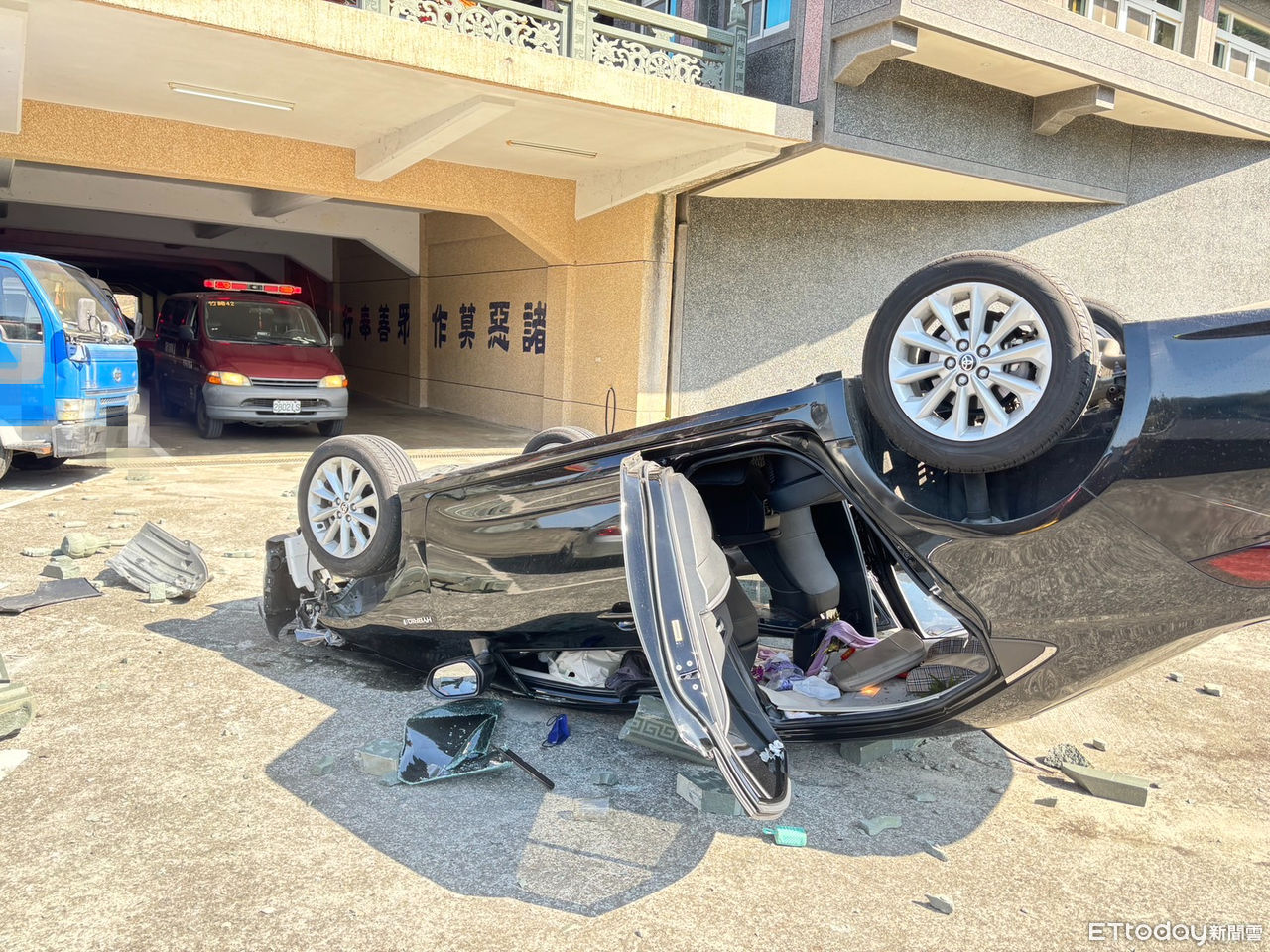 嘉義縣竹崎鄉桃源村三寶山靈嚴禪寺今(27)日上午10時11分發生意外!1輛在2樓的轎車不明原因衝斷石製護欄,當場飛墜到1樓,車頂著地,救護人員到場緊急將車內62歲、77歲女子送往嘉義基督教醫院救治,所幸僅肢體擦傷,意識清楚無大礙,詳細事發經過與原因還有待進一步釐清。