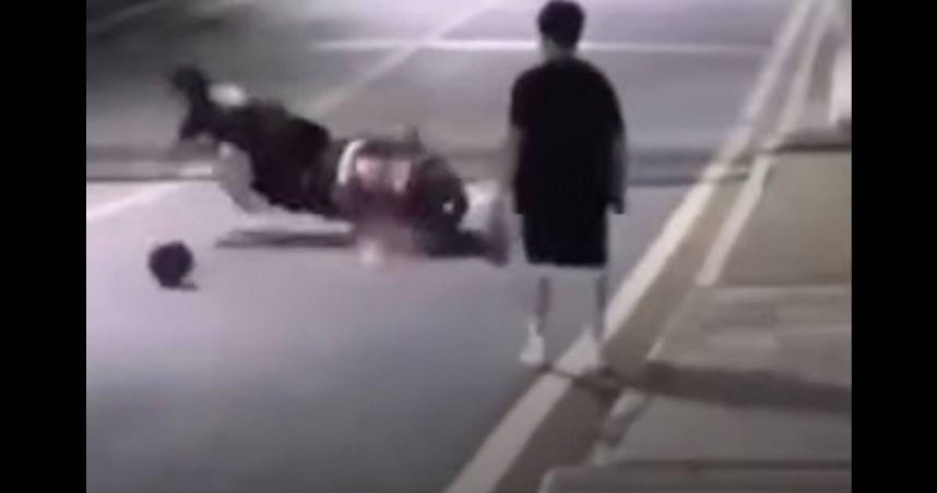 籃球滾進車道後,馬上就有一輛雙載機車駛來,由於事發突然,駕駛來不及煞車,直接壓過籃球後重心不穩,駕駛與後座乘客雙雙噴飛慘摔在大馬路上,兩人和機車都翻滾好幾圈才停下。男孩一開始雖作勢撿球,卻也被眼前的一幕嚇傻。