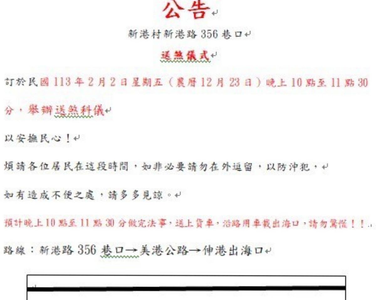 據了解,新港村該名村民厭世輕生,家屬於2月2日當天舉辦告別式,當天深夜舉行送煞科儀,村長為了讓村民安心,特意貼出送煞公告,也告知村民留意,並希望送煞過程順利。