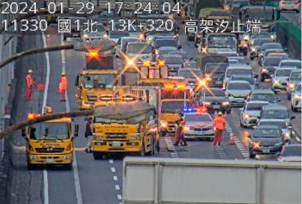 國1北向13.8K高架汐止端路段,今(29)日下午4時44分發生小貨車側翻事故,占用外2線道,回堵5公里,詳細事故原因仍待調查釐清。