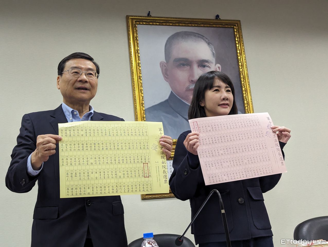 ▲曾銘宗、謝衣鳯一同展示正副院長投票樣張。(圖/記者鄭佩玟攝)