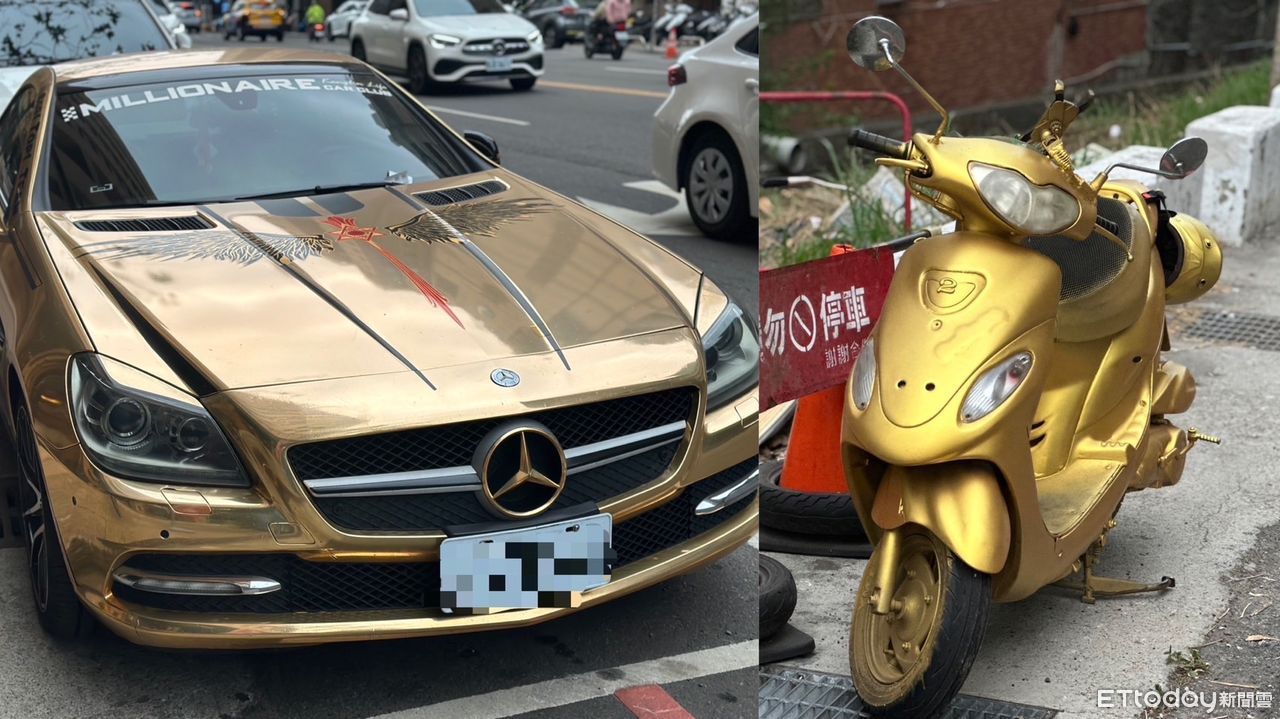 最後這台並非名貴跑車,而是南屯區一處社區大樓附近,一輛近20年的老機車被塗滿金漆,看上去雖然奪目,但是可以發現多處相當隨意,車主可能是自己動手DIY,賦予老機車新生命,就連掛在上頭的安全帽也是全金色,整台車除了車燈、部分座墊,全都是金色,就連輪胎側邊也染上金色。