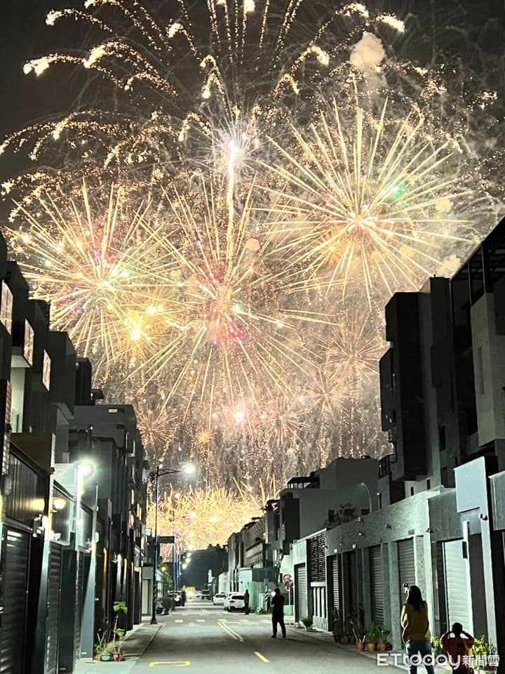 據了解,民眾參加朋友新家入厝,以及家中神明安座,選在30日晚間熱鬧封街席開幾十桌宴請家人親友,正值飯菜入肚溫飽之時,一連串的煙火秀就在晚間八點多陸續施放,一層一層的煙花火焰接棒施放過程大約8分鐘,火焰將整個黑夜點亮如白晝,蹦蹦蹦的煙火施放聲響讓不少民眾走出戶外一看究竟。也因為巨大聲響讓不少人以為打仗了!以為是阿共仔打過來!