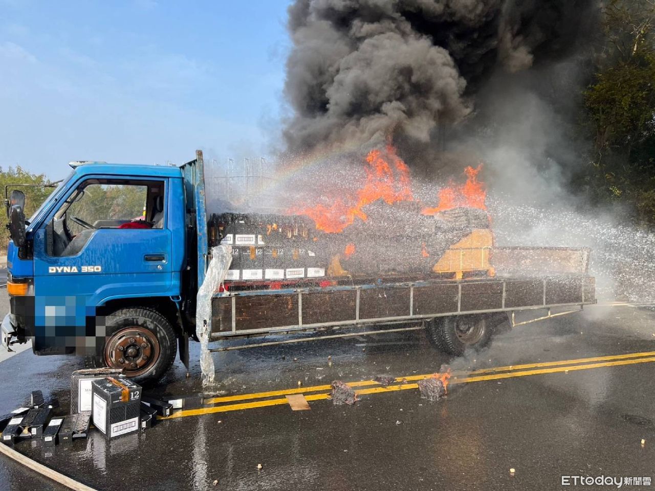 ▲金門貨車後斗起火,12年麥卡倫洋酒燒毀,損失約172萬。(圖/記者林名揚翻攝,下同)