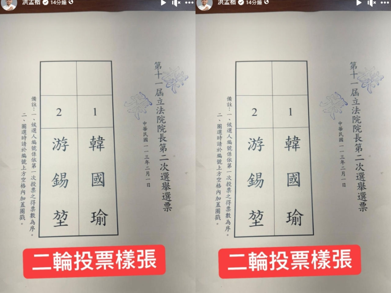 立法院長選戰1日登場,目前正在進行第二輪選票,國民黨立委洪孟楷曝光選票樣張,上面僅有1號國民黨的韓國瑜及2號民進黨的游錫堃。會議主席柯建銘也提醒在場立委,選票不要汙染。