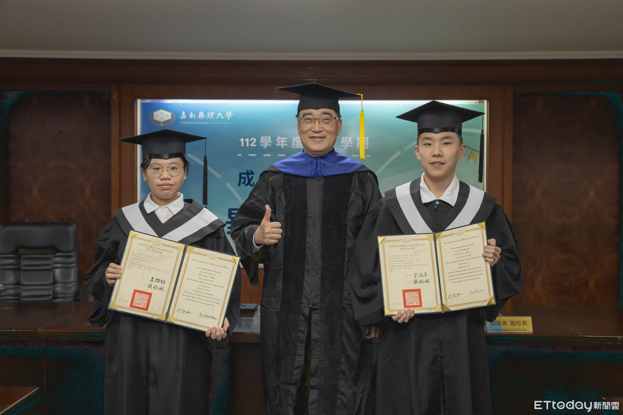 ▲嘉南藥理大學舉辦簡單溫馨隆重的微型畢業典禮,為成績優秀提早完成大學學業的食品科技系石靜瑜及公共安全與消防學士學位學程簡辰祐同學,頒發畢業證書。(圖/記者林東良翻攝,下同)