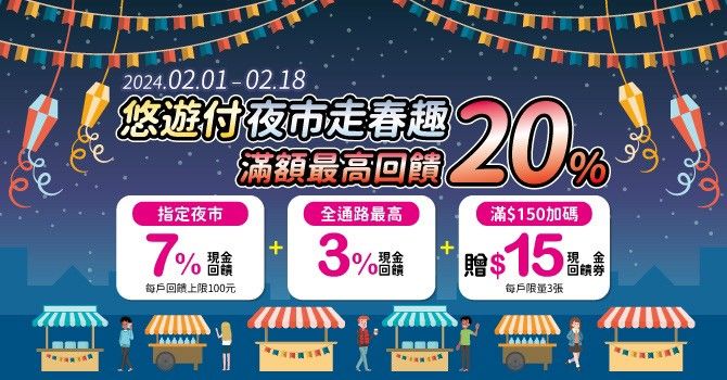 不僅如此,悠遊卡公司指出,只要到消費滿150元的夜市走春,除了享有筆筆7%回饋,還可加上「全通路筆筆最高回饋3%」活動,以及15元現金回饋券換算約10%回饋,三者回饋疊加起來,最高可達20%回饋。春節夜市逛街,一邊品嚐美食一邊購物,使用悠遊付支付,只需手機一手搞定,實現無現生活。