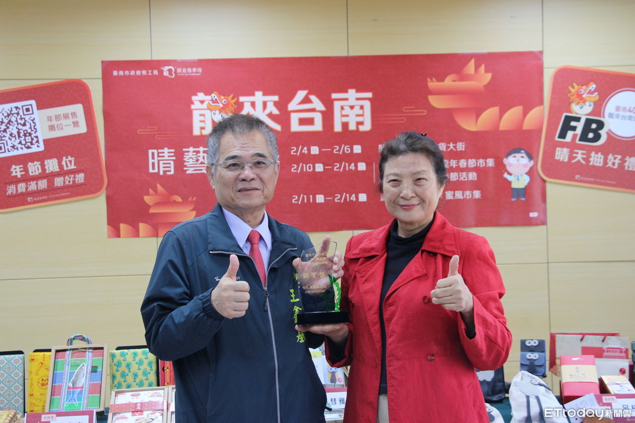 ▲台南市勞工局晴天坊把握年節商機,辦理「龍來台南・晴藝迎春」記者會,以及頒發晴天坊「2023年勞工局晴藝獎-手創藝品競賽」前3名得獎作品,共同推廣春節活動,歡迎民眾暢遊台南。(圖/記者林東良翻攝,下同)