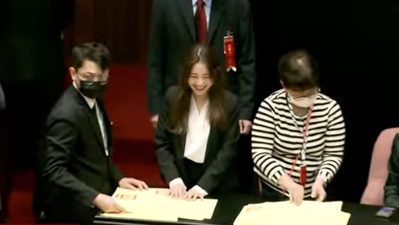 立法院正副院長選舉今(1日)落幕,由國民黨立委韓國瑜領導國會,副院長則是藍委江啟臣,兩人於下午5時35分許,在大法官見證下,宣誓就職。不過在開票過程中,有眼尖網友發現,一名監票的女性工作人員外型亮眼,甚至與「啦啦隊女神」林襄有幾分相似,意外掀起話題。