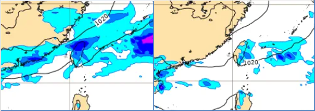 下週三(7日)鋒面逐漸南下,下週四(8日)降雨範圍逐步擴大至中部,南部山區亦有局部短暫雨的機率(左圖),除夕(9日)降雨稍減少(右圖);下週三起冷空氣亦逐漸南下,濕冷的天氣持續至除夕;以達「大陸冷氣團」的機率為最高,北部沿海及部分平地將降至11度左右。至於各國模式模擬年初一、二(10、11日)的天氣,差異大、且持續調整,應繼續觀察。