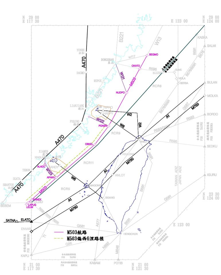 中國民航局1月30日宣布,2月1日起取消M503航線自北向南飛行偏置,後續並將啟用連接M503航線的W122、W123航線由西向東飛行,使航線更靠近海峽中線。