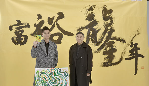 ▲陳彥彰老師(左)邀請張炳煌大師揮毫龍隆書法合文於特製五公尺寬的金色宣紙上。(圖/元智提供)
