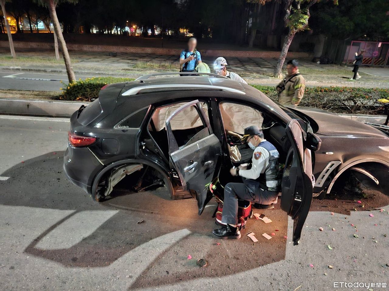 警方調查,47歲翁姓男子當時駕駛休旅車,沿國泰路二段南往北方向行駛,行經路口時,因不勝酒力先擦撞右側安全島,再失控撞擊左側安全島,因猛力撞擊,導致3顆輪胎彈飛,而散落物則波及到行駛於慢車道的31歲黃姓女騎士。