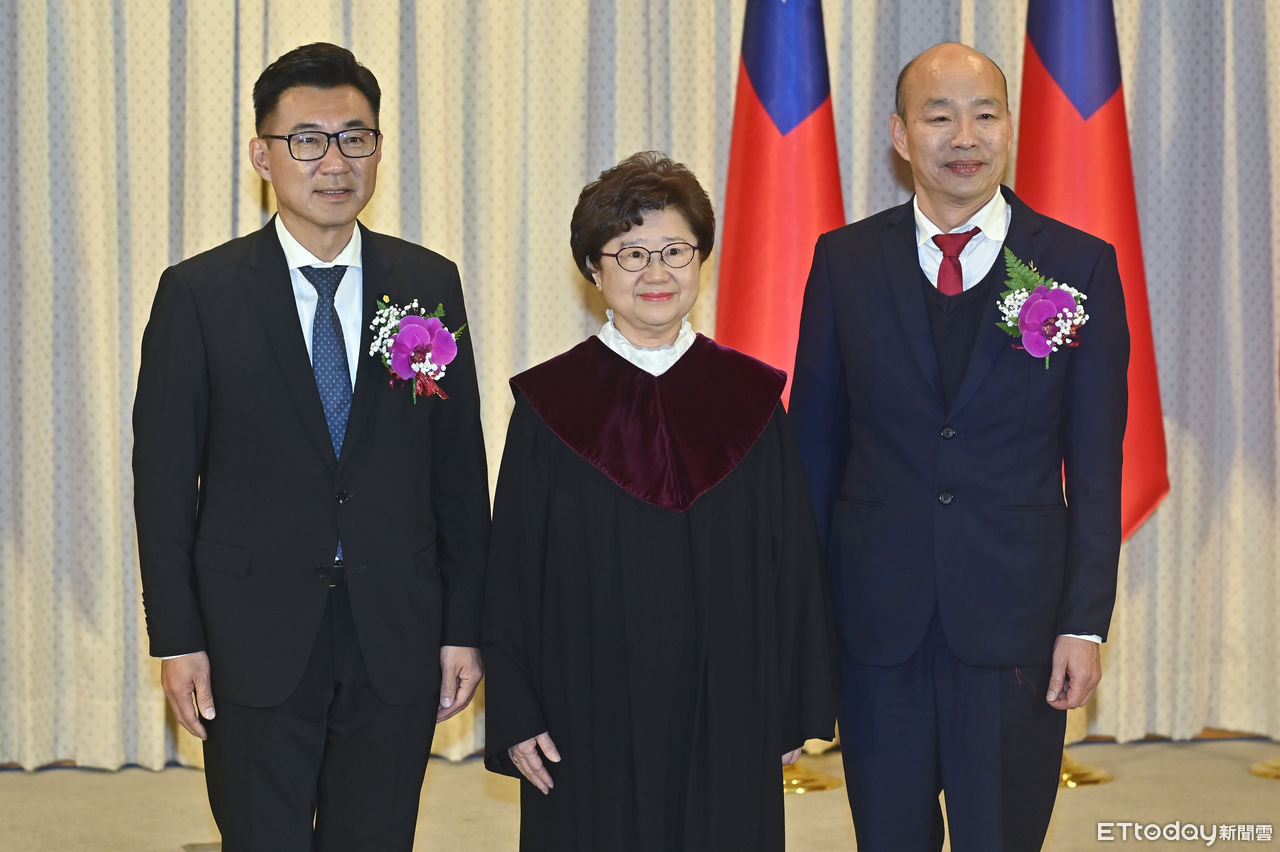 ▲立法院第11屆立法委員1日報到,新任立法院長韓國瑜(右)與副院長江啟臣(左)宣誓就職。(圖/記者李毓康攝)