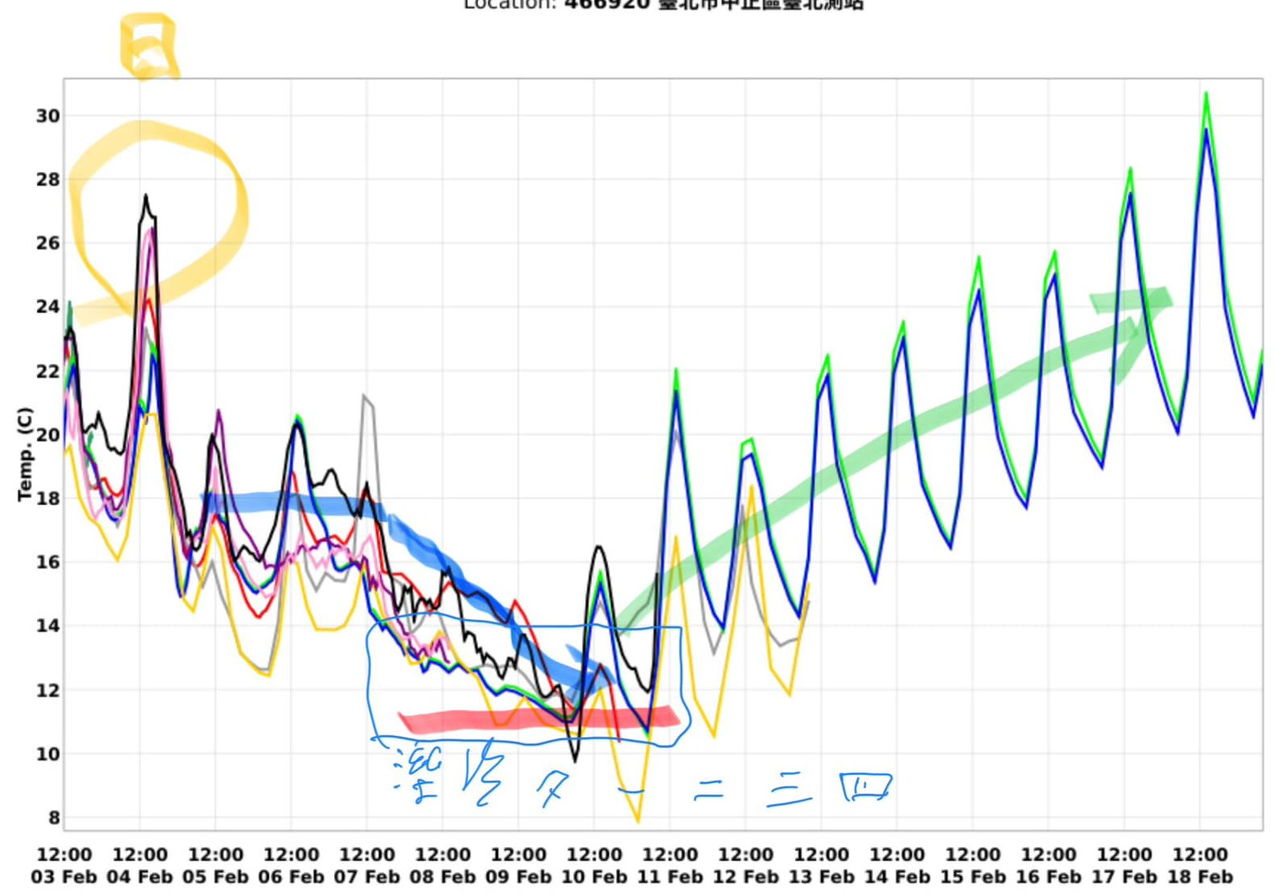 ▲過年前再轉冷,圖為各模式模擬台北氣象站未來氣溫趨勢圖。(點圖可放大/翻攝彭啟明臉書)