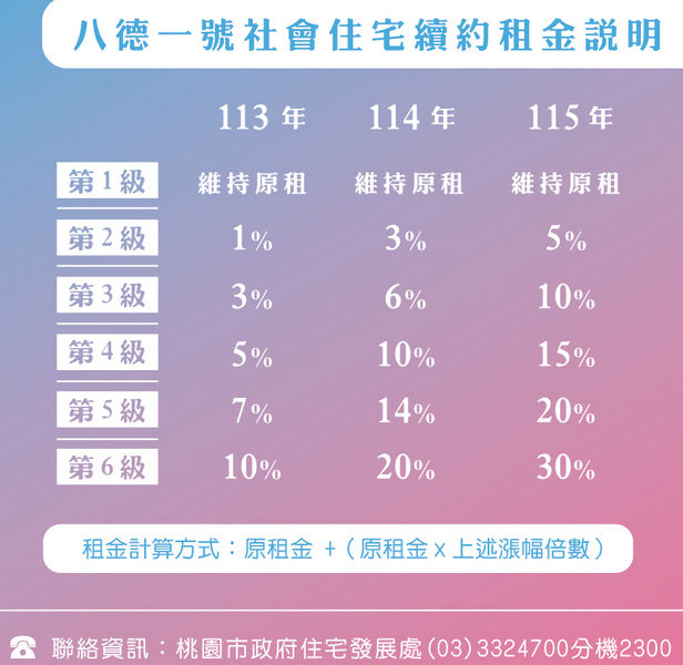 為落實照顧經濟弱勢戶安居的政策目標,桃園市政府住宅發展處3日到八德一號社宅召開「續租租金說明會」,第一級續租租金凍漲,第二至六級續租租金將以原租金作為調整基礎,分三年逐步調漲,累計調整幅度為原租金5-30%。另外,今年陸續將有八德二號、中路一號面臨續租,屆時將依第一至六級租金最高漲幅不超過30%的機制訂定。
