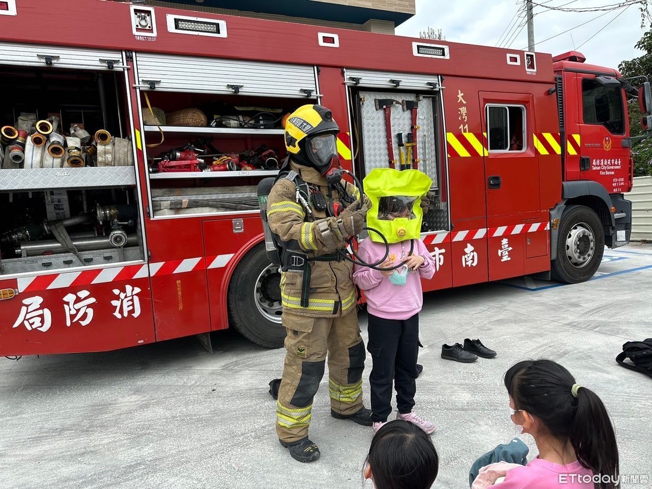 ▲台南市消防局大灣分隊5日上午舉辦「小小消防員體驗活動」宣導,藉由活動讓學童體驗消防與防災,建立各項消防知識。(圖/記者林東良翻攝,下同)