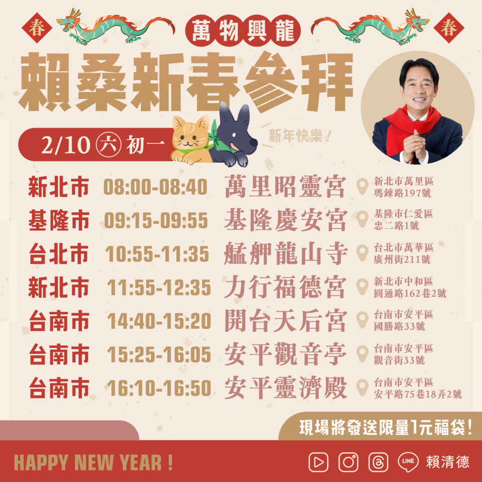▲賴清德釋出新春參拜行程。(圖/翻攝自賴清德官方Line,下圖同)