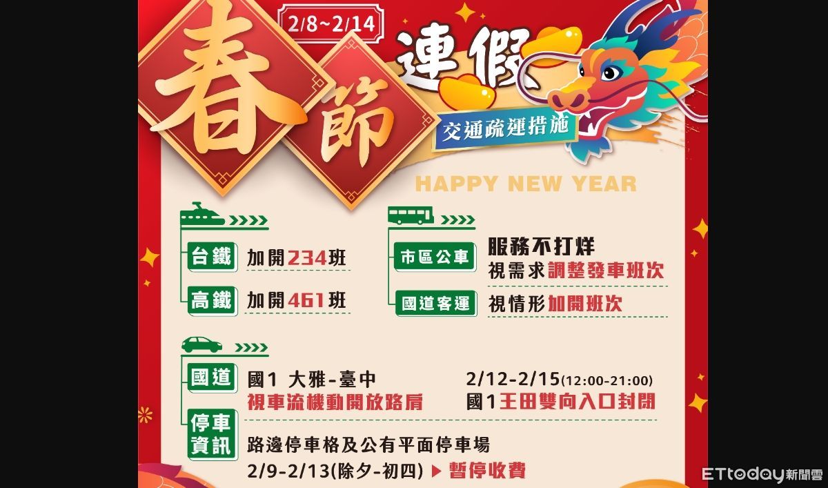 客運方面,將視情形加開班次因應,市區公車2月9日(除夕)全日班次減半,2月10日(初一)至2月14日(初五)將視營運需求依比例調整;國道中部路段部分,春節連假期間國道1號南向大雅至台中路段易出現塞車,現有開放路肩措施照常實施,高公局視情況彈性增加開放路肩時段,另2月12日(初三)至2月15日(初五),每日12至21時,國1王田雙向入口封閉,禁止車輛進入。