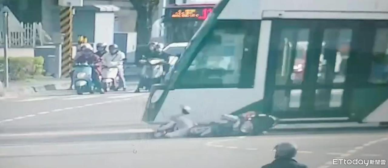 ▲高雄輕軌今年第5撞,機車違規右轉遭撞倒。(圖/記者賴文萱翻攝,下同)