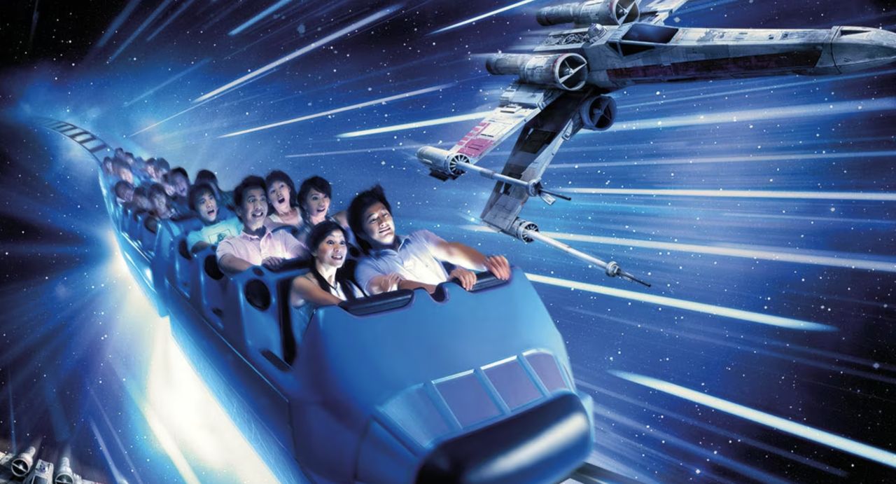 香港迪士尼的「星戰極速穿梭」由迪士尼的經典設施「飛越太空山」(Space Mountain)改建而成,於2016年正式營運,遊客將扮演《星際大戰》中的反抗軍,搭乘「X翼戰機」高速穿梭在星戰世界的太空戰場,與大批帝國軍的「鈦戰機」對抗。