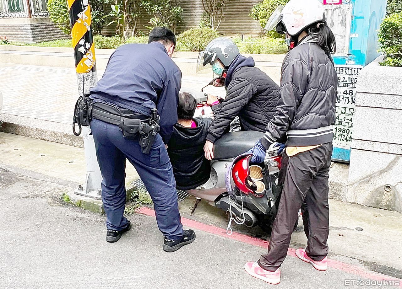 ▲鍾姓婦人昨天下午騎機車要到銀行換新鈔,卻突然自撞電線桿摔車,巡邏警方與路人見狀上前攙扶。(圖/記者沈繼昌翻攝,下同)