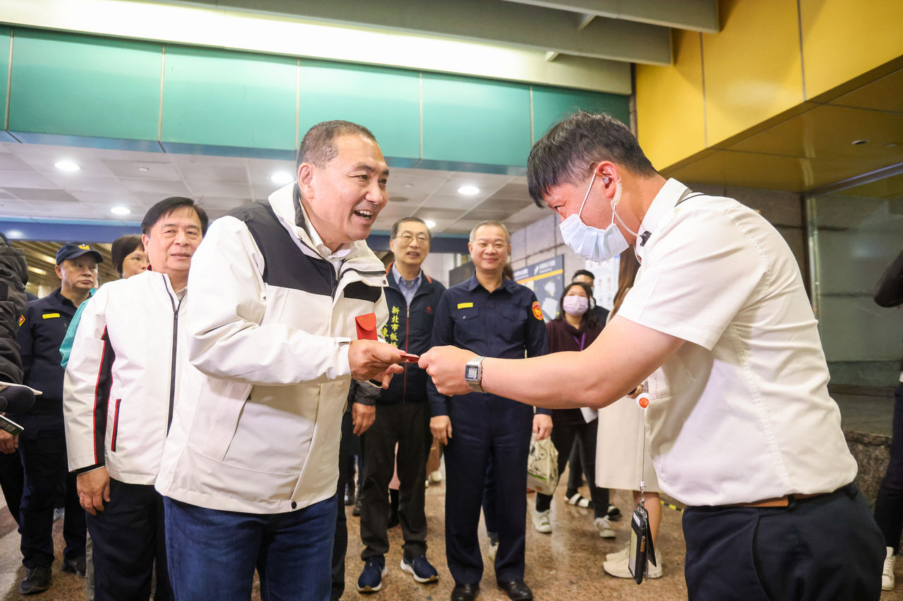 今(7日)是農曆春節連假前最後一天上班日,新北市長侯友宜傍晚到板橋車站關心春節返鄉交通疏運情形,慰勞臺鐵、高鐵和警察駐在所輪值人員,並透過預錄廣播向市民朋友拜個早年及發送龍年福袋,祝福大家「吉龍舞春(台語諧音:錢都有剩),新的一年龍舞幸福(都有幸福)!」