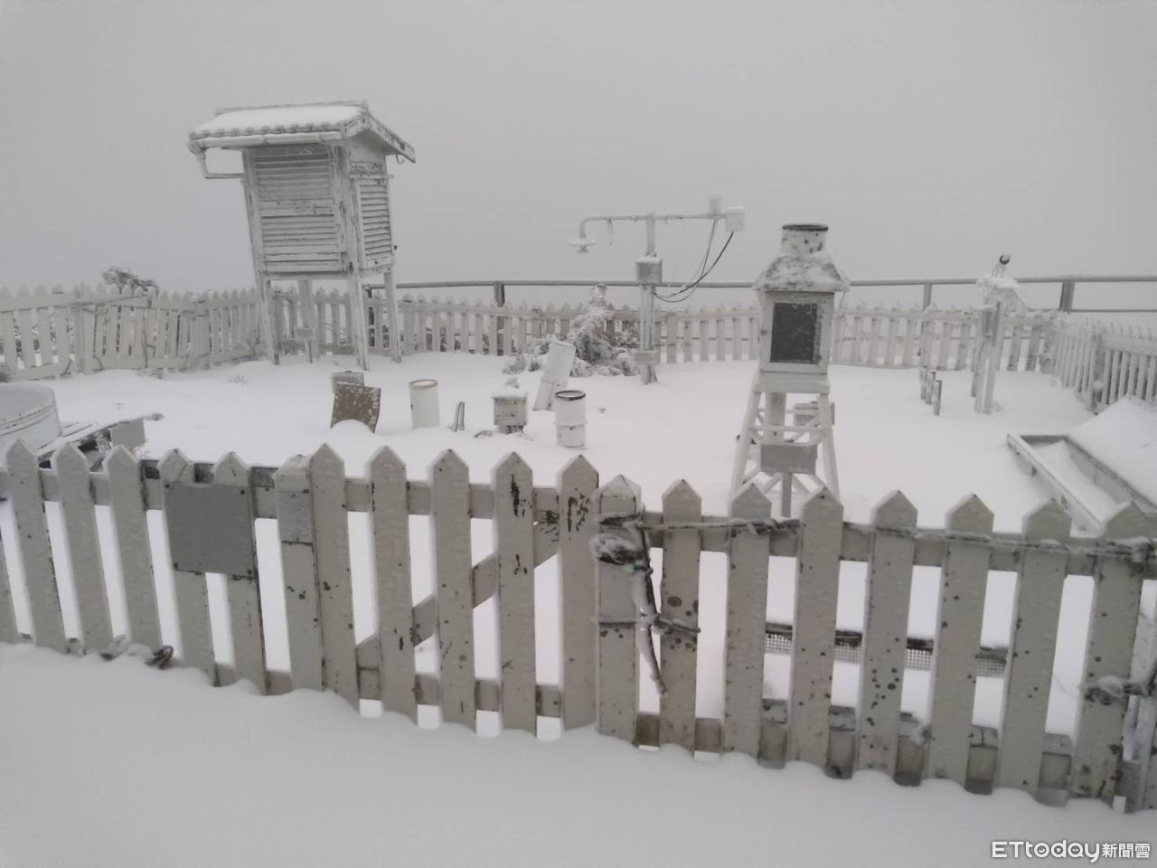 據中央氣象署監測資料,玉山北峰於今清晨開始降雪,直至7時30分積雪約5公分,氣溫零下1.8度;排雲山莊則於清晨5時降冰霰後轉降雨,氣溫1度。