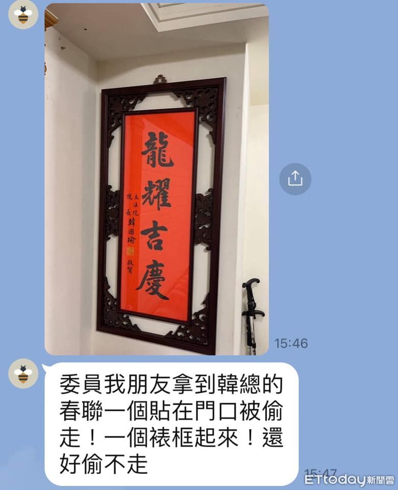 韓國瑜署名的燙金版春聯「龍耀吉慶」是今年最搶手的春聯,不少藍營民代服務處被索討一空,洪孟楷今(9)日在臉書放上一張照片,照片中有支持者跟洪孟楷說,他朋友拿到韓總的春聯被偷走,另外一個直接裱框起來,「還好偷不走」。該對話也放上把韓國瑜春聯裱框的照片。