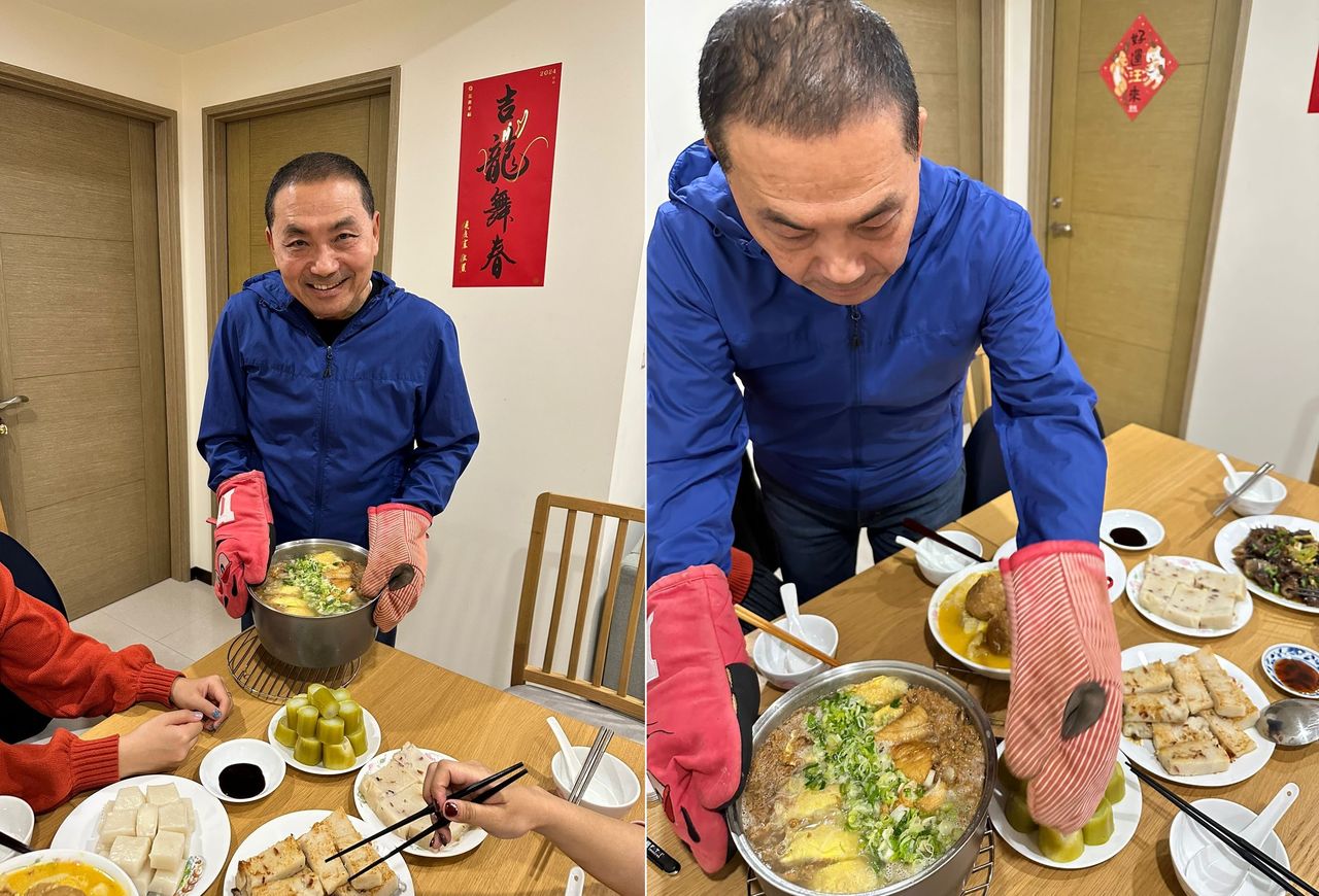 侯友宜9日晚間PO出照片表示,侯家的年夜飯口味清淡,必備的長年菜、家人愛吃的白年糕、台式蘿蔔糕、白菜獅子頭,再加上一鍋鮮甜的冬粉蛋餃魚湯,雖稱不上澎湃,但只要一家人能團聚在一起話家常,對他們來說就是最實在的幸福。
