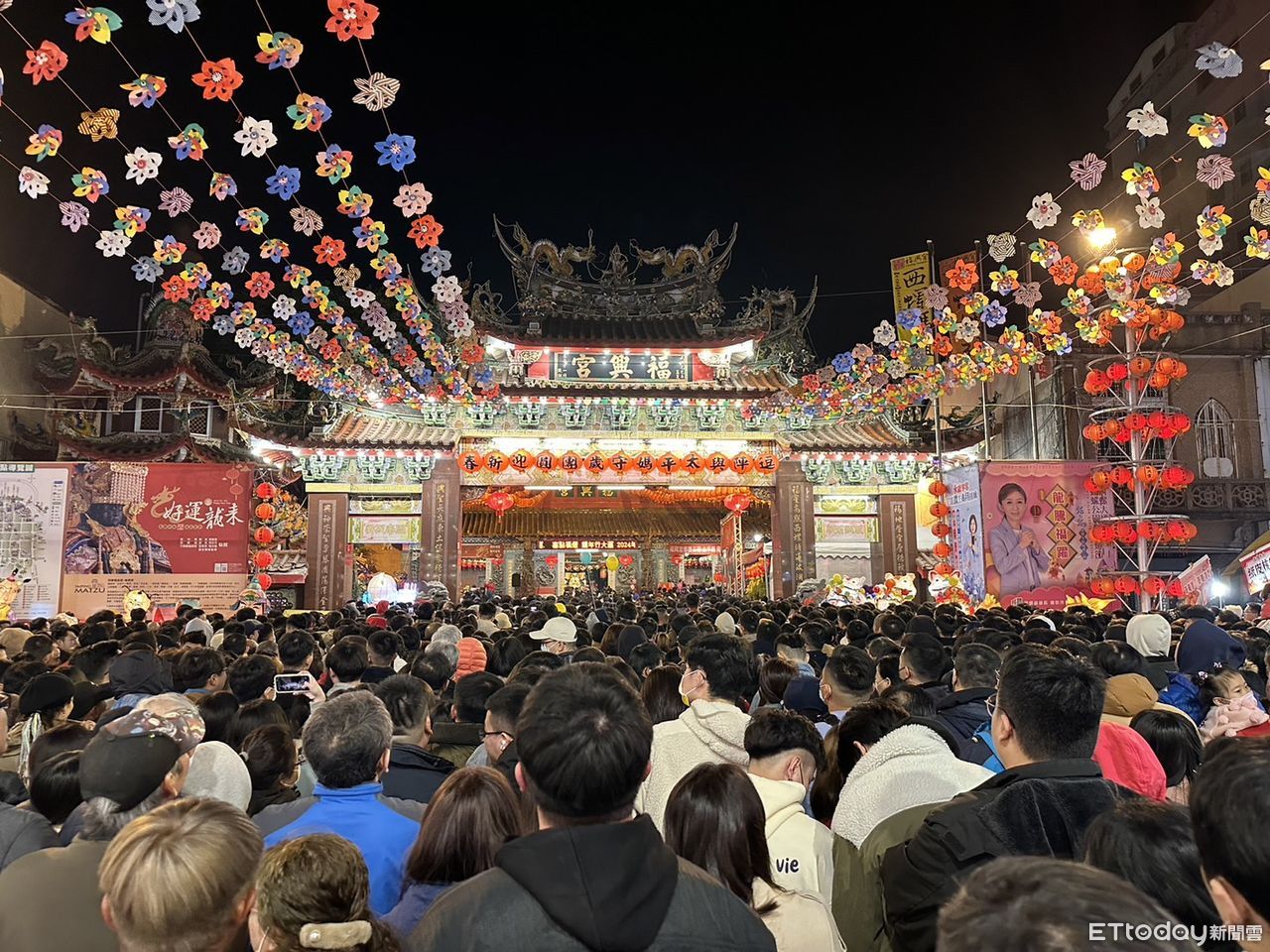 今日大年初一凌晨零時一過,開啟廟門讓信眾插頭香祈福,陸續湧進虔誠上香膜拜的信眾,經AI人流計數系統統計,初一凌晨子時開廟門後,光廟內即湧入約25萬3156人次祈福、搶頭香。領美金紅包排隊人龍包圍更是沿著福興路、中山路、繞回建興路一直排到九層粿店門口,將近500公尺相當壯觀,人潮飆破百萬。
