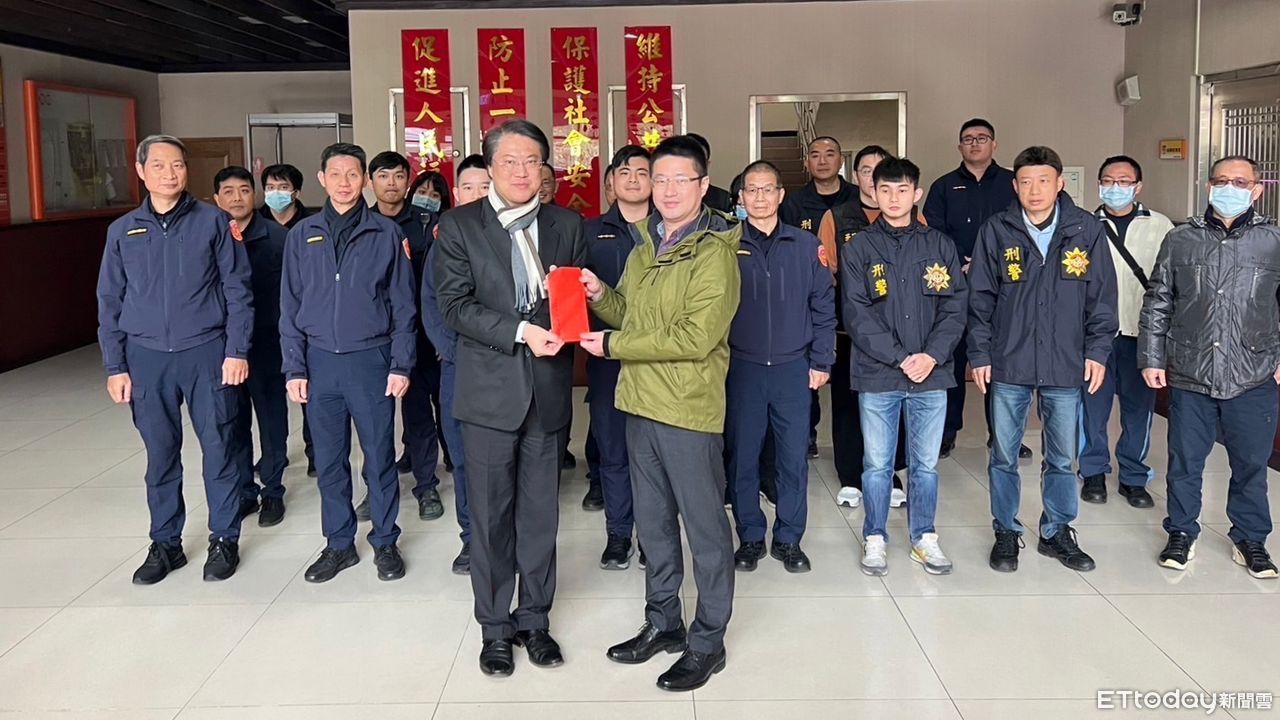 ▲基隆市警察局第四分局長洪政崴(右)代表接受內政部長林右昌(左)頒發春節慰問紅包。(圖/記者郭世賢翻攝,下同)