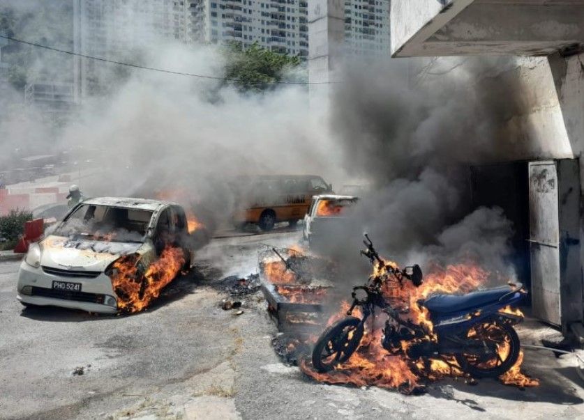 綜合當地媒體報導,這起事件發生於10日上午11時45分左右。當時,檳城發林新市鎮的一座露天停車場突然起火,不僅冒出滾滾濃煙,火舌還猛烈地吞噬了停放在露天停車場的車輛。