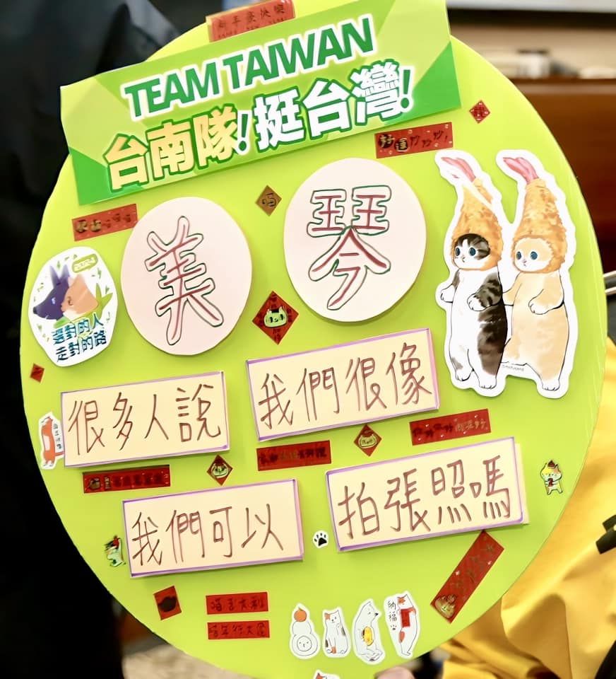 蕭美琴表示,昨天大年初二到台南東門巴克禮教會發送福袋,現場來了很多鄉親互道恭喜,讓小小的教會變得非常熱鬧,其中有一位年輕女生,拿了一塊精心製作的手板要跟我合照。可惜因為時間的關係來不及拍,只好請民進黨立委林俊憲代為保管。