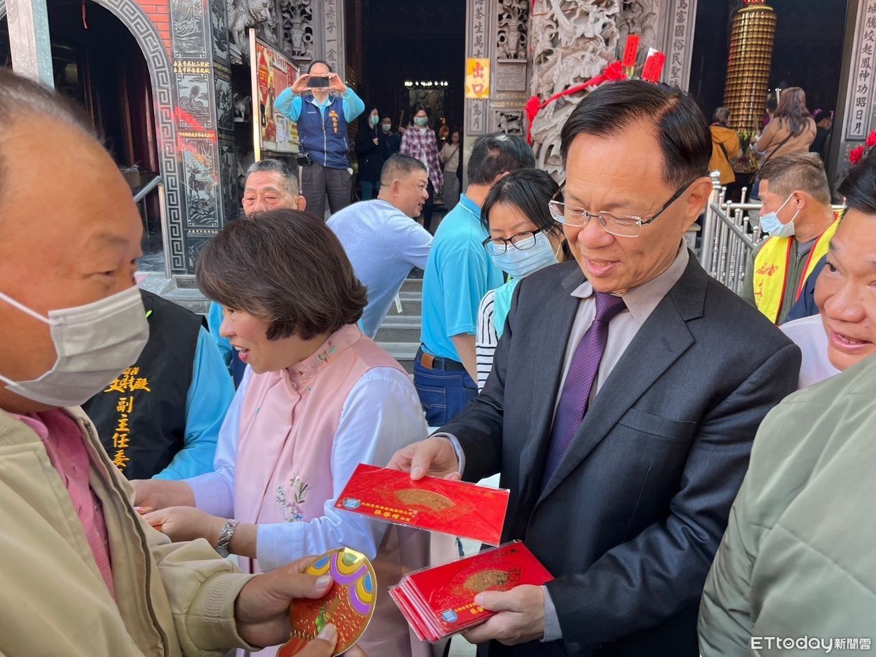 ▲民眾黨立委張啟楷巧遇嘉義市長黃敏惠,一起上香與發放祈福的紅包和錢母。(圖/翻攝張啟楷臉書,下同)