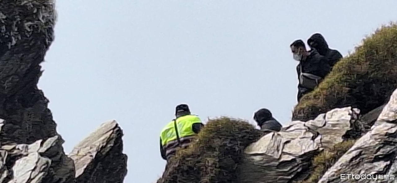 武嶺停車場後方山壁也是部分民眾攀高拍照的「熱點」,導致巡邏員警也得隨之爬上陡峭的坡壁,逐一開口勸離,整天下來對體力和喉嚨都是沉重的負擔。