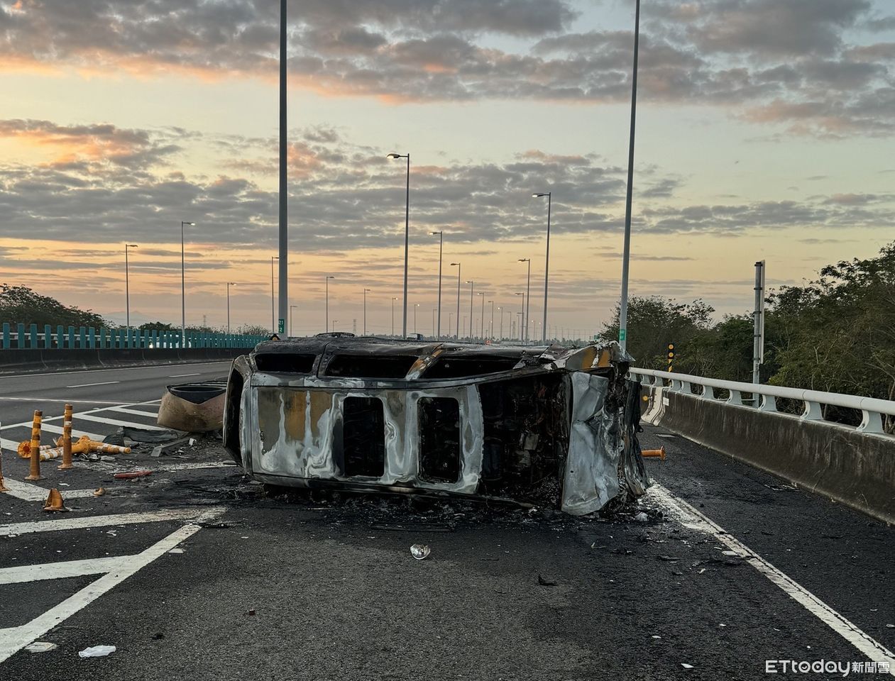 國道3號南向421.3公里(崁頂出口匝道)今(15)日發生一起火燒車事故,當時一輛客貨車不明原因衝撞分向桿及槽化線緩撞設施後,整輛車側翻起火。警消獲報後趕往搶救,火勢撲滅後發現車上一具焦屍,身分還有待後續法醫生物檢測確認釐清。
