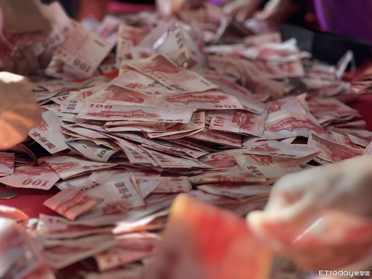 ▲彰化元清觀拿畚箕點鈔。