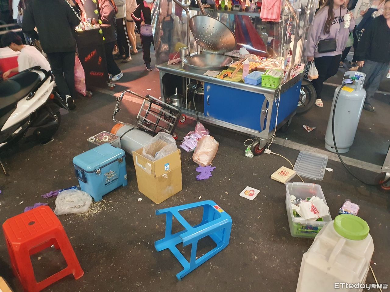 ▲地瓜球攤因衝突物品散落一地 。(圖/記者陳以昇翻攝)