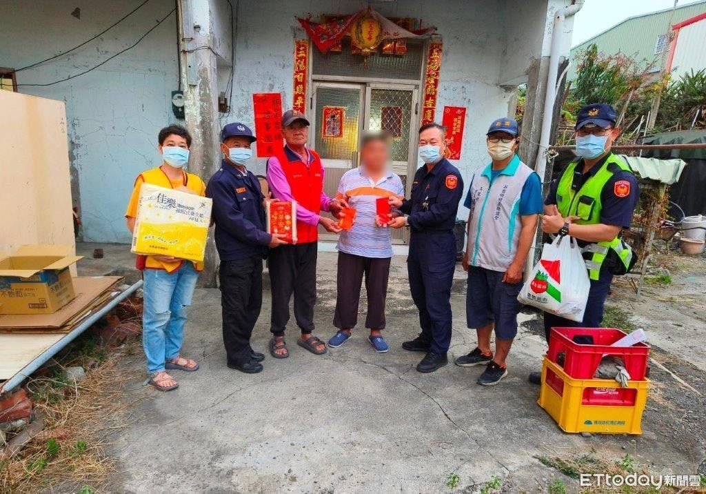 兩警於勤查時得知施男狀況後,主動關懷並聯繫烏龍村長偕同善心人士崇聖殿慈善功德會郭委員,以及新園義警分隊、新園志工小隊共同攜帶民生物資前往慰問並致贈慰問金新台幣1萬元,解決燃眉之急。